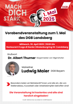 Der Deutsche Gewerkschaftsbund (DGB) lädt auch in diesem Jahr wieder zum 1. Mai der Arbeiterbewegung. In unserem Einzugsgebiet im bayrischen Oberland finden Veranstaltunen zum 1. Mai in Landsberg am Lech, Wolfratshausen und in Oberhausen statt.